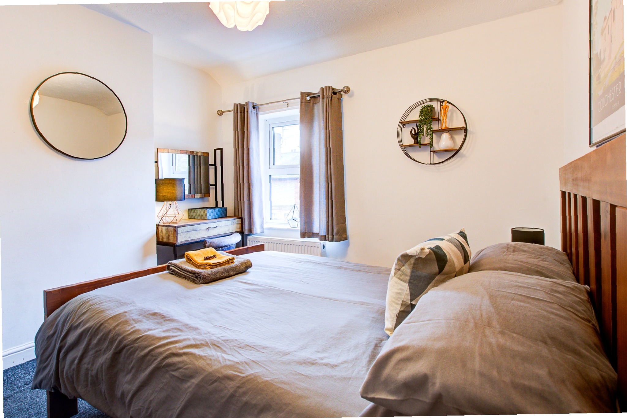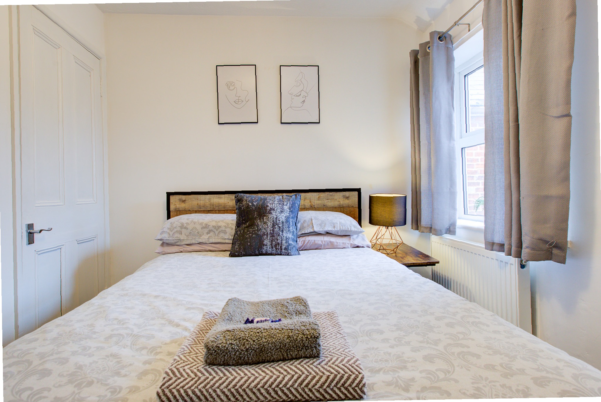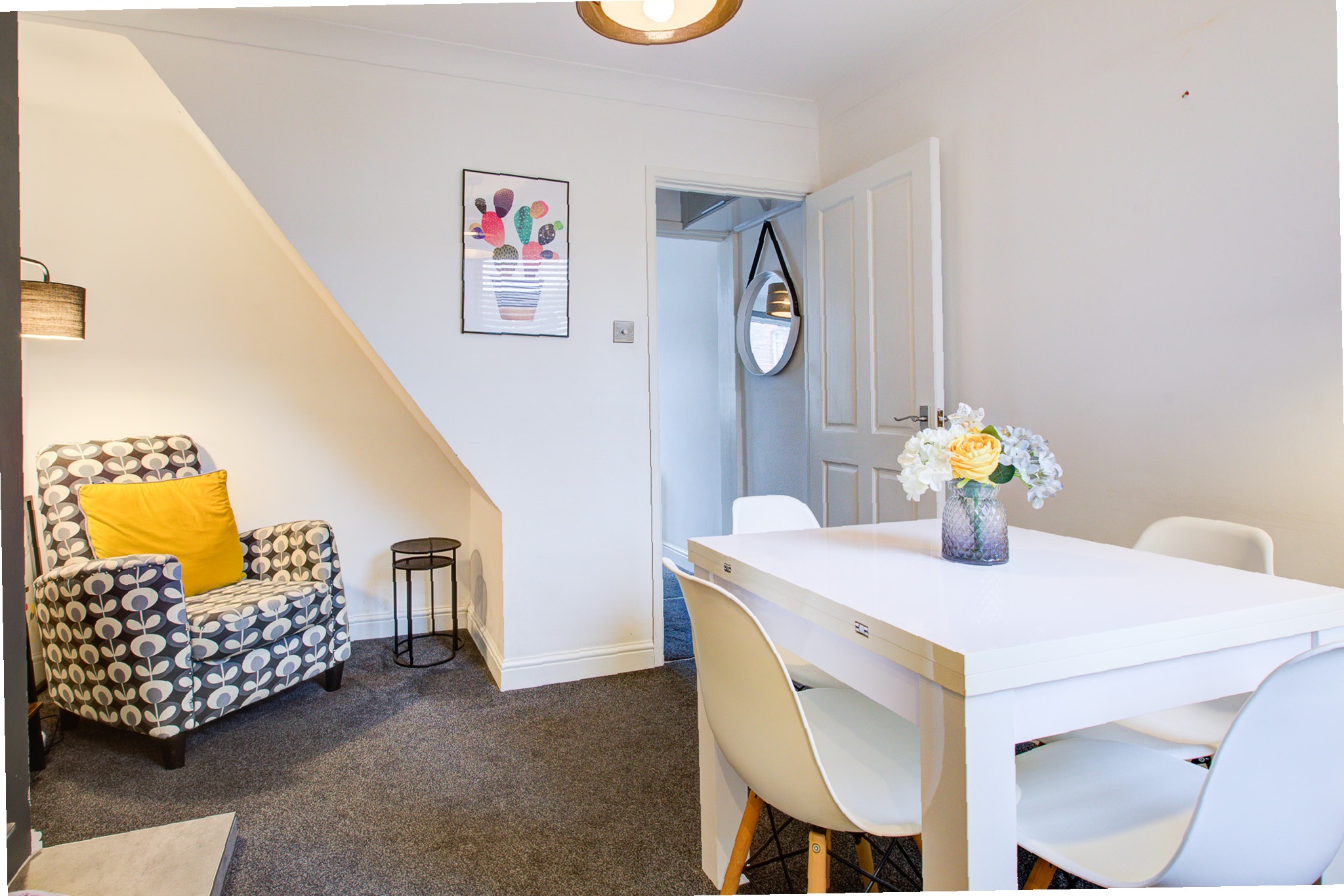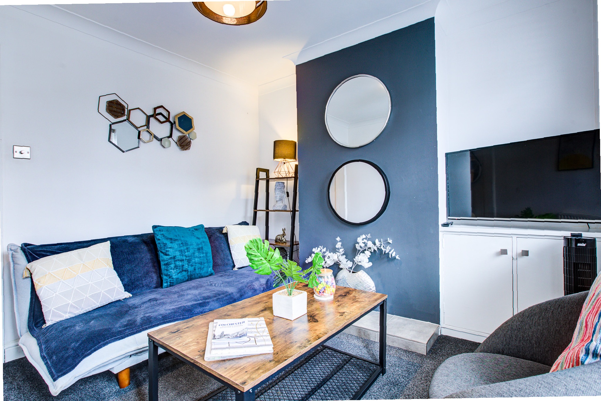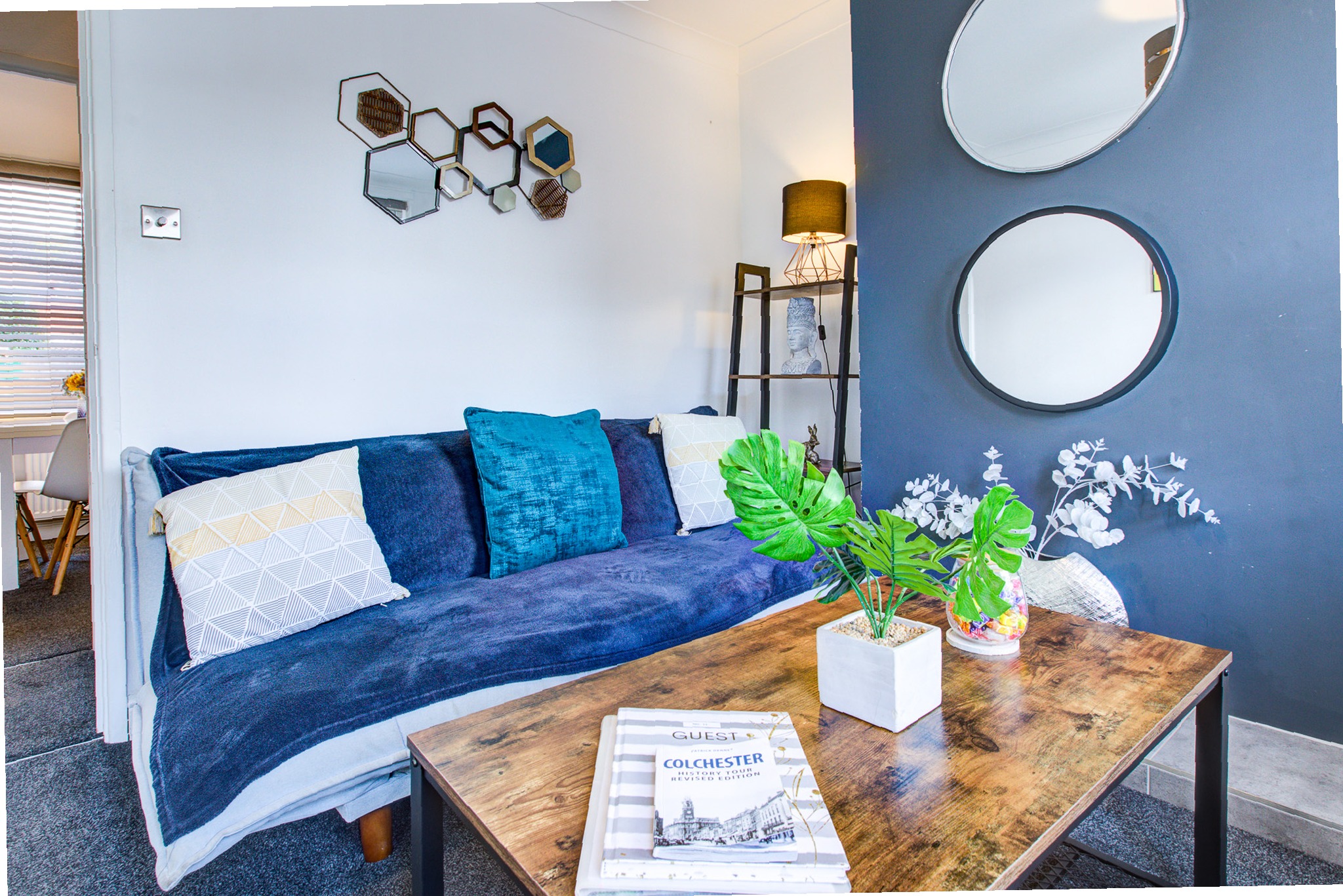 No.11 is set up for people working in Colchester. Two double bedrooms sleep 4, plus study with foldout bed for a 5th. Dedicated workspace with desk for admin or video calls. Fully equipped kitchen - gas hob, oven, microwave, fridge freezer, washing machine. Free parking with digital permit. 15-min walk to North station, 4-min drive to A12. Unlimited WiFi, Smart TV, private patio. Quiet residential street.