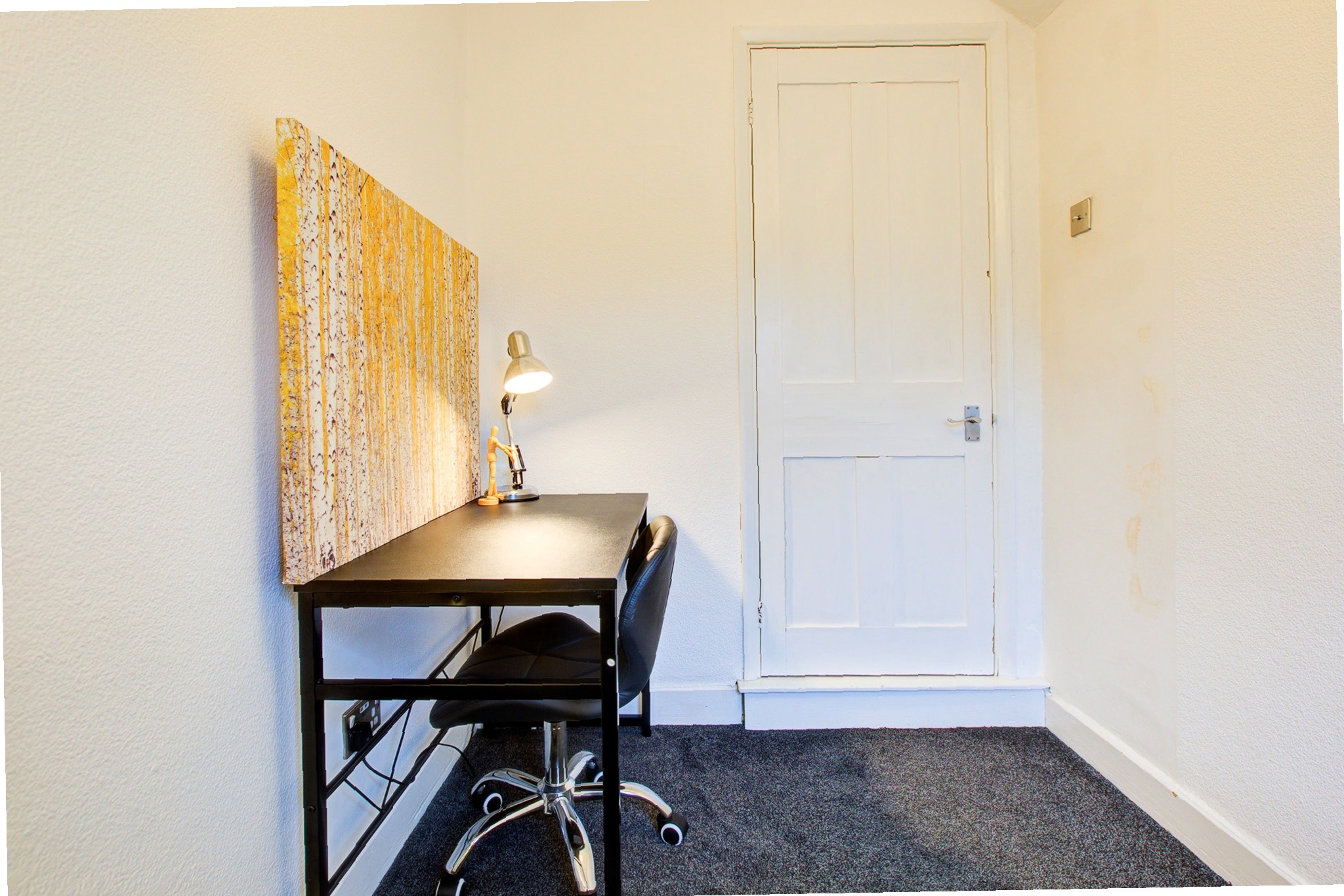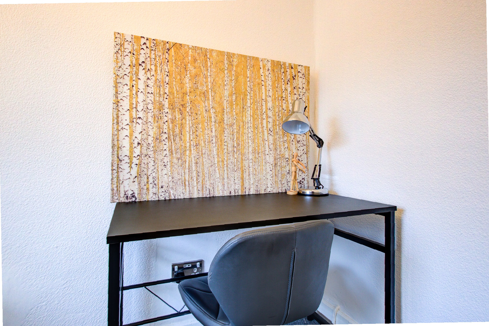 Workspace: Dedicated desk with chair, lamp and power sockets